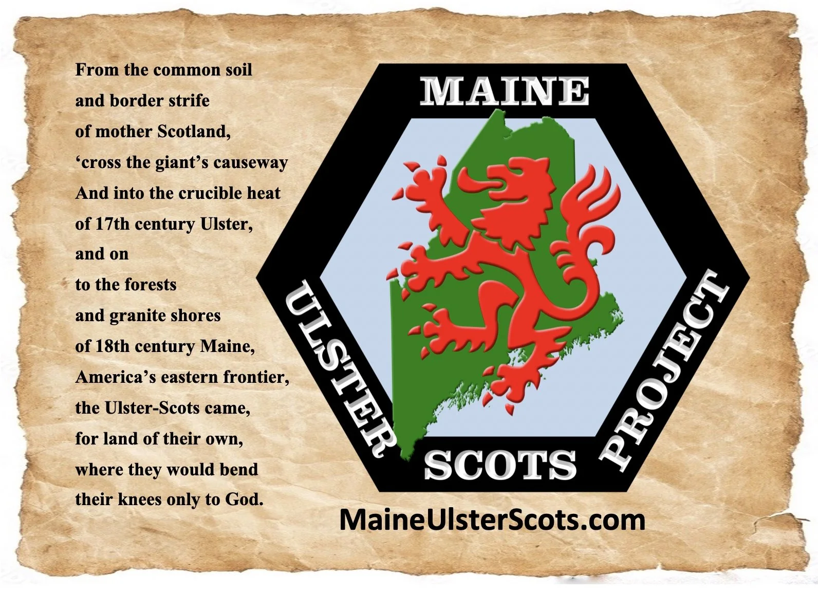 The Maine Ulster-Scots Project (MUSP) was founded in 2005 by a handful of Ulster-Scot descendants who refused to see their heritage over-looked and forgotten. The desire to Save and Share Maine’s rich Ulster-Scot heritage soon led to a logo designed by Bill Mckeen with input from Alister McReynolds and John Mann utilizing elements that embody our Scotch-Irish heritage: the hexagon border symbolizes the shape of the stones that make up the GIANTS CAUSEWAY in Ulster (now Northern Ireland), the LION RAMPART honors Scotland, original home of our traditions and culture, and the green STATE OF MAINE set in a blue background commemorates the coast and forest of Maine.