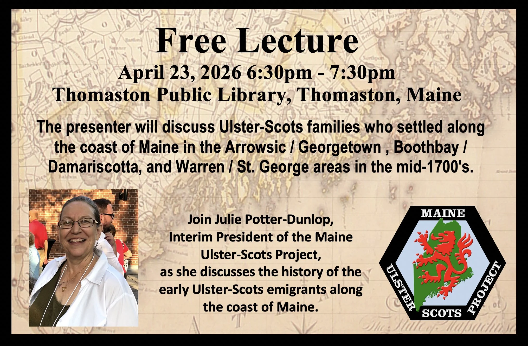 Julie Potter-Dunlop, President, Maine Ulster-Scots Project gave a lecture at the Thomaston Public Library, Thomaston, Maine.She discussed the history of the early Ulster-Scots emigrants along the coast of Maine, including those that settled in the Arrowsic / Georgetown / Boothbay / Damariscotta, and Warren / St. George areas in the mid-1700’s