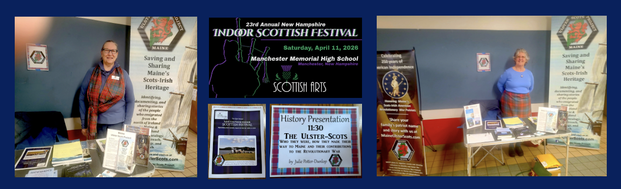Open Roundtables: The Maine Ulster-Scots Project will be hosting our 3rd online discussion on the Ulster-Scots who settled in Maine. We will explore various topics, including family stories and genealogy, their origins and experiences upon arrival, Scottish/ Ulster and Maine history, and topics of specific interest to YOU!